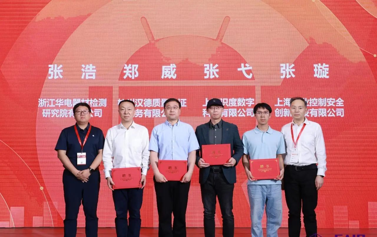工作组组长郑军奇、副组长刘宇飞为来自浙江华电器材检测jiuyou.com九游有限公司、杭州汉德质量认证服务有限公司、上海识度数字科技有限公司、上海工业控制安全创新科技有限公司工作组新进成员颁发专家聘书。